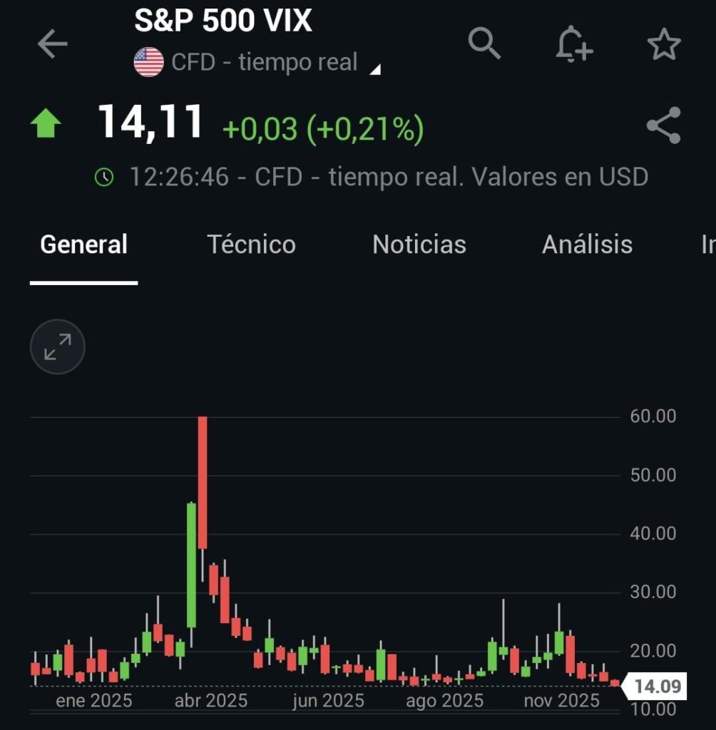 El VIX, conocido como el “índice del miedo”, mide la volatilidad implícita esperada del S&P 500 durante los próximos 30 días, basada en precios de opciones. Cuanto más alto está el VIX, mayor es la percepción de riesgo y nerviosismo en los mercados; cuando baja, indica mayor confianza y expectativas de estabilidad.