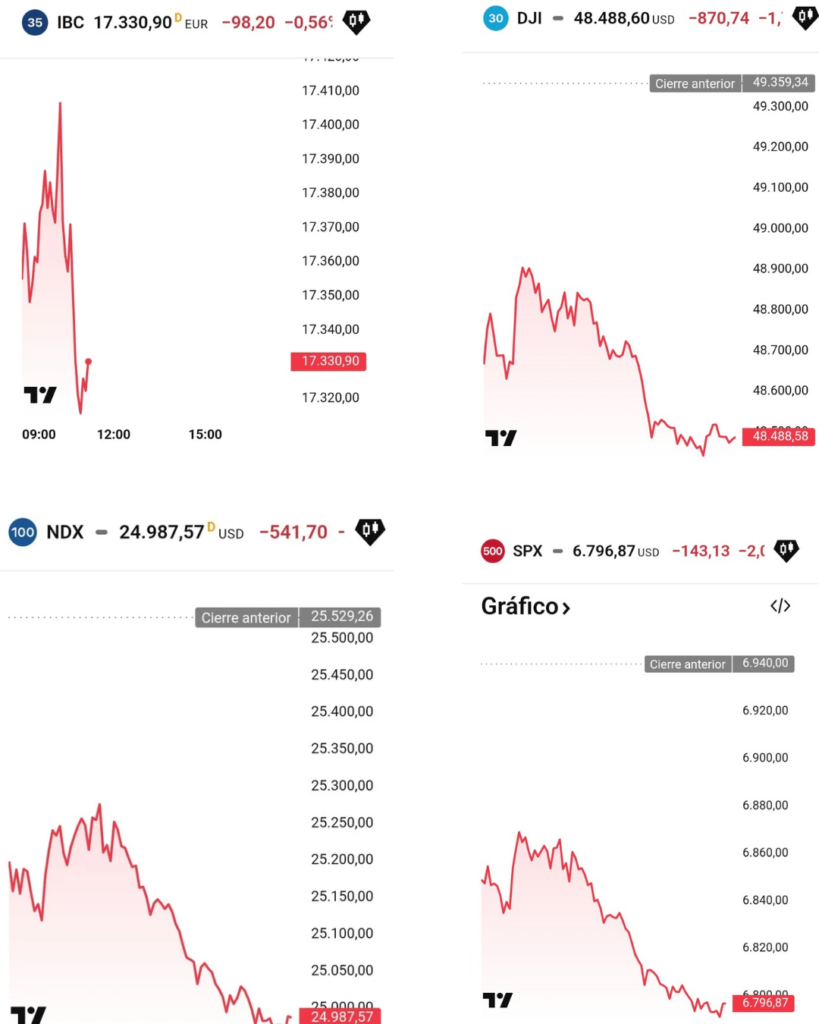 Las bolsas internacionales atraviesan una jornada de alta volatilidad, marcada por fuertes caídas en los principales índices de Estados Unidos, Europa y Asia. El aumento de la incertidumbre geopolítica, las tensiones comerciales y el deterioro del sentimiento inversor están provocando un movimiento global de aversión al riesgo, afectando tanto a renta variable como a sectores cíclicos clave.